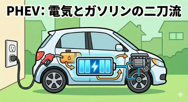 - PHEV(プラグインハイブリッド車): 電気とガソリンの二刀流。充電不安をなくしたい方へ。